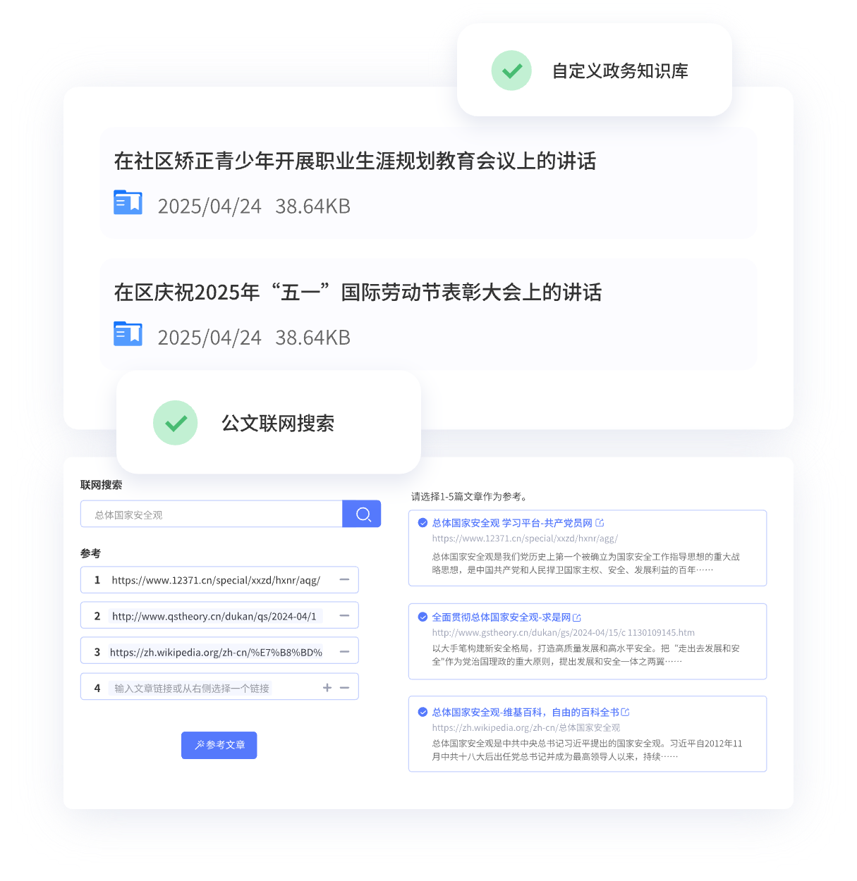 您可上传本地文档或将平台文档转移至知识库。在生成公文时,打开"知识库参考"功能,AI即会自动匹配相关知识库材料,生成符合您自己写作风格的公文。