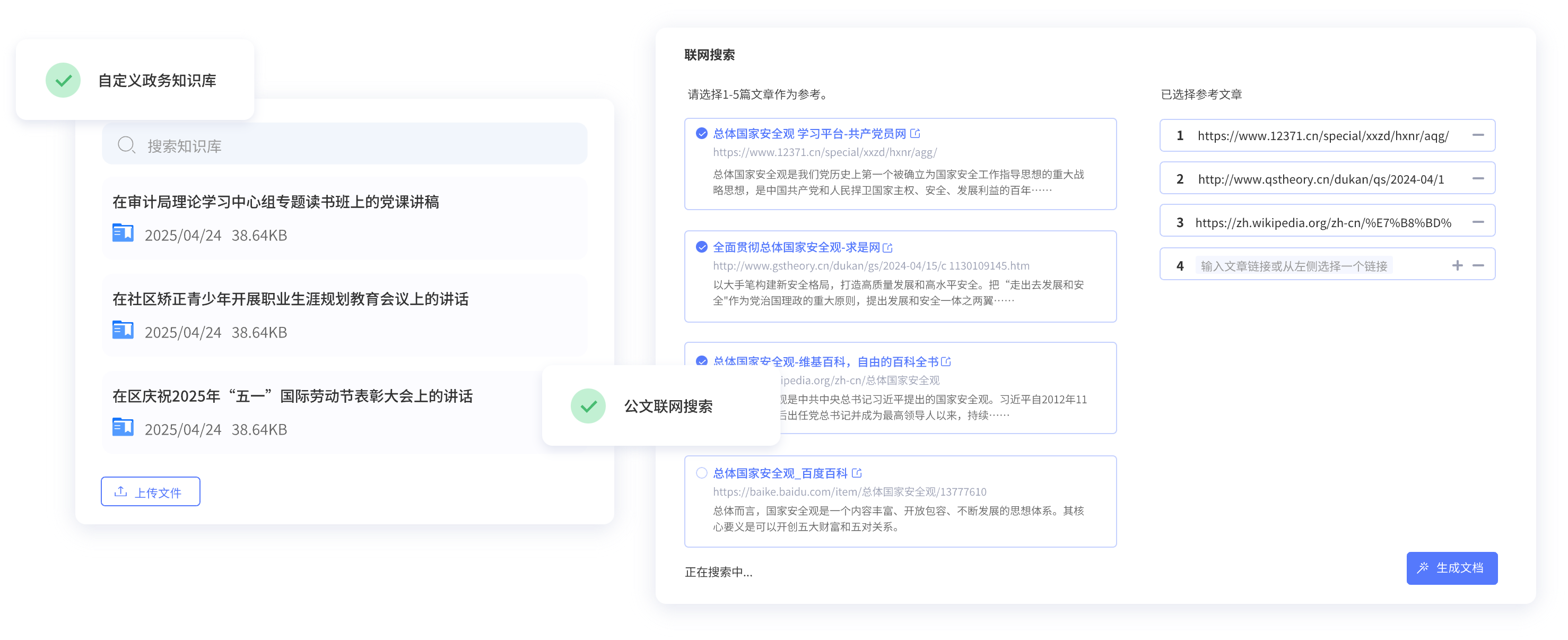 上传政务或个人写作常用材料,用于精准生成符合自己写作风格的公文